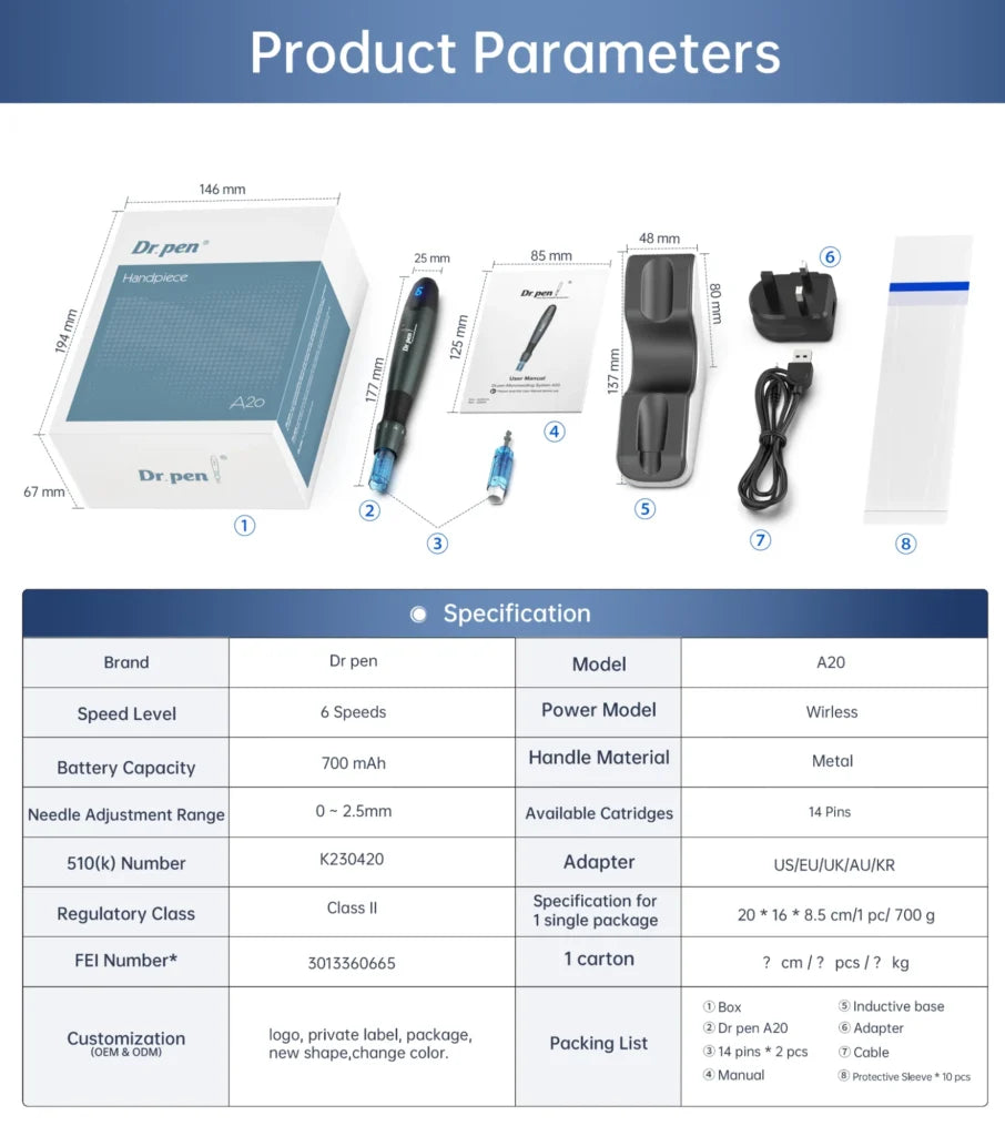 Step into the future of skin rejuvenation with the Dr. Pen® A20, an advanced, Medical-Grade Microneedling Device engineered to redefine aesthetic treatments. Backed by FDA clearance and Health Canada Licensed, the A20 brings together innovation, performance, and peace of mind, delivering high-quality results that professionals can count on.