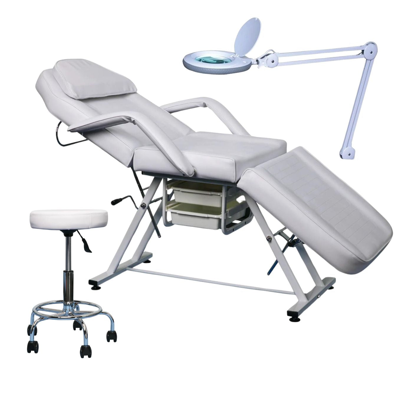 Furniture Package A includes a standard Facial Bed (PB813), LED mag lamp (PB338), and a round Gas Lift Stool (PB2006). Furniture and stool fabric are white.
