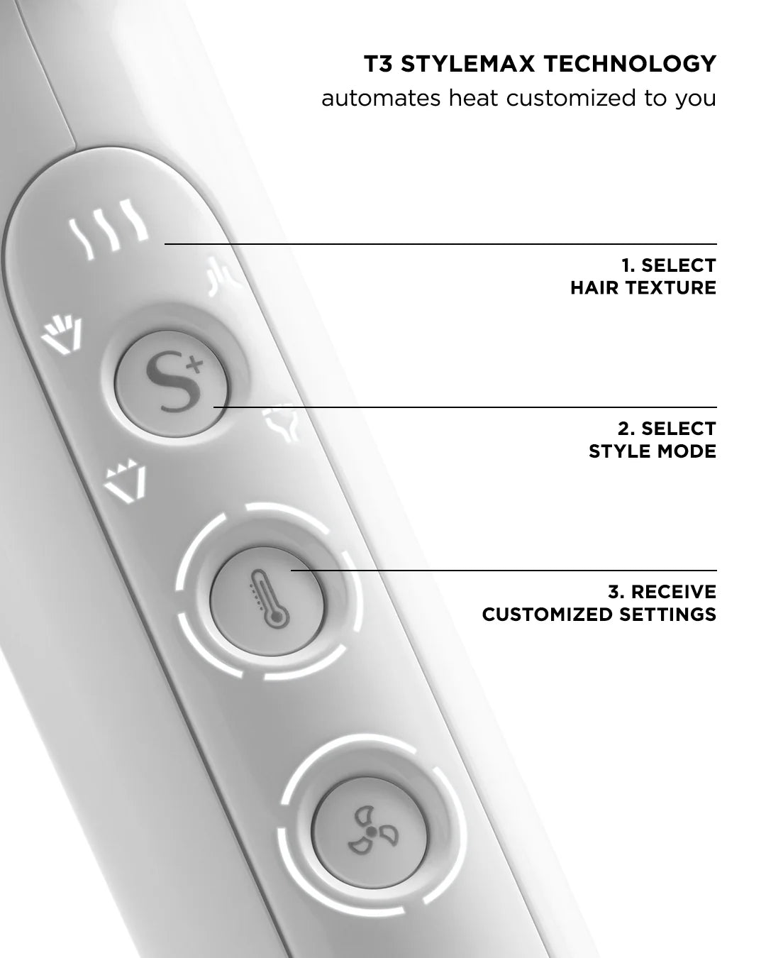 Find the heat that's right for you. The T3 Featherweight StyleMax Professional Hair Dryer automatically customizes heat and airflow based on your hair texture and styling goals for better results with less damage.1Four attachments pair with four unique styling modes to rough dry, smooth, diffuse or volumize. Simply select your hair texture, attach the attachment and choose the styling mode to discover your personalized settings for faster drying and a shiny, frizz-free finish without excess heat.
